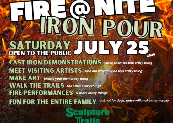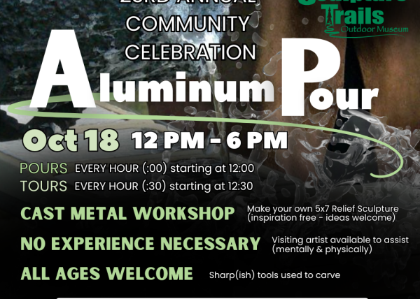 For over 20 years Sculpture Trails Outdoor Museum is hosting its annual aluminum pour. Come out to the Museum in October and see the artists at work and you can create a relief sculpture in Aluminum of your own! All ages and experience levels will love this process.